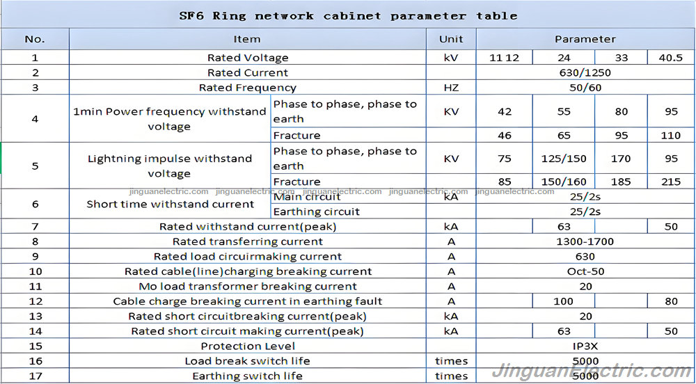 TiraThai's SF6 Switchgear is precision-engineered for robustness, with baseline specs expandable through customization. Below is a detailed table of key parameters, validated through Jinguan Electric's certified testing and compliant with GB 3906-1991, IEC 62271-103, and DL/T 402 standards.