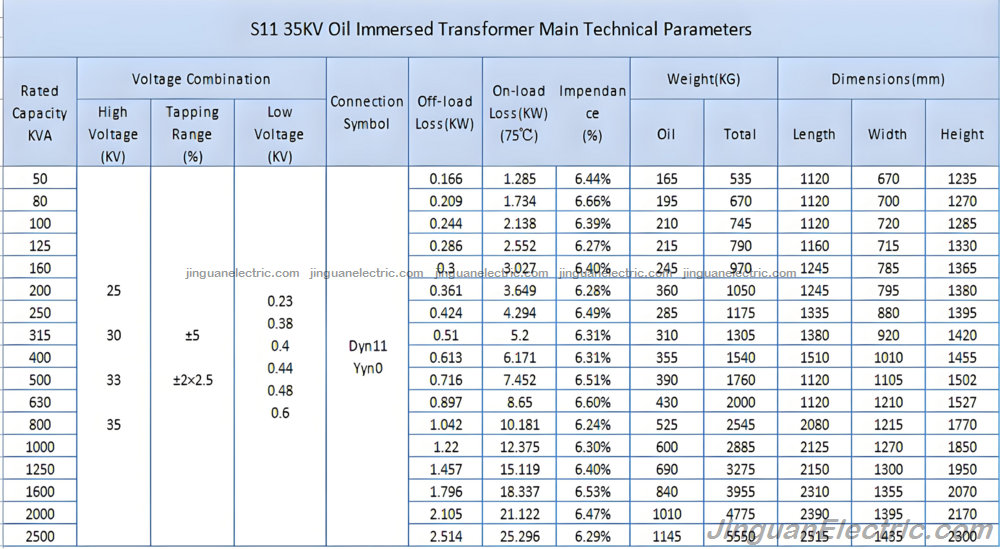 TiraThai 35kV transformers are precision-built for reliability, with specifications expandable via customization. The table below details core parameters, based on Jinguan Electric's validated testing.